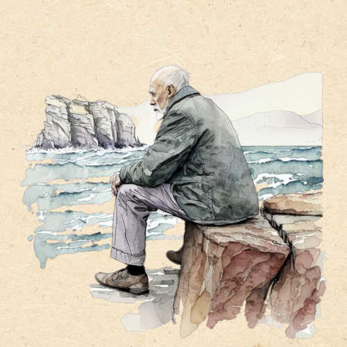 一個悲傷的老人坐著凝視著大海